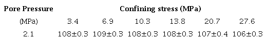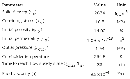 Following the standard method, the sample was saturated at a confining stress (σc) of 13.8 MPa and at a room temperature (295 K). A constant flow rate of 0.1 ml/min was applied until the inlet pressure (pin ) reaches a plateau (approximately after 48 h) at 6.9 MPa. The resulting differential pressure (σc -pin ) of 6.9 MPa was enough to avoid core-sleeve interface flow and provides a seal between the sleeve and the coreholder.
