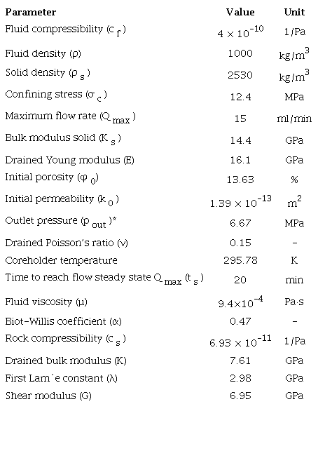 The initial conditions for pore pressure is set equal to the outlet pressure (p0 = pout ) and zero for displacement (ω0 = 0), respectively. The core is subjected to a constant pore pressure of 6.9 MPa and the radial confining stress sequence shown in Table 2, each for a time period of 40 min. The left and right sides are fixed, i.e. non-displacement in both radial and axial directions.