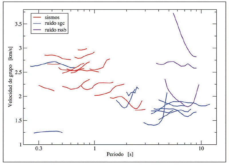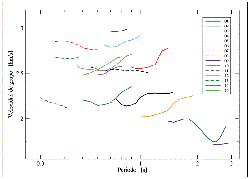 En términos generales se observa una disminución de la velocidad de grupo estimada desde valores alrededor de 2.5 km/s entre 0.3 y 1 s de periodo a valores alrededor de 1.7 km/s entre 4 y 10 s de periodo. Los resultados para la RSSB son dispares a pesar que el rango de periodos es similar en los tres casos. A pesar de ello, es claro que las ondas de Rayleigh muestreadas por esta red corresponden a capas profundas. No se observa semejanza entre resultados, aun cuando las trayectorias sean cercanas, lo que sugiere que la incertidumbre asociada a nuestras estimaciones de velocidad de grupo es elevada. Esto no es inesperado debido a que las ondas Rayleigh concentran su energía en los estratos situados sobre el basamento rocoso, y en éste presentan amplitudes que decaen exponencialmente al aumentar la profundidad, o sea al aumentar el periodo de la curva de dispersión. Esto hace que sea difícil estimar la velocidad de propagación del basamento rocoso en cualquier caso (Chávez-García, 2007).