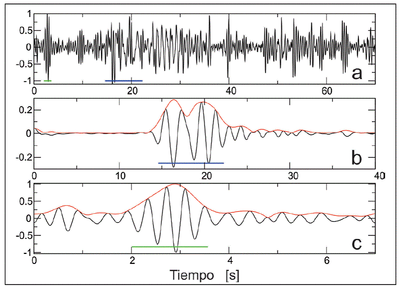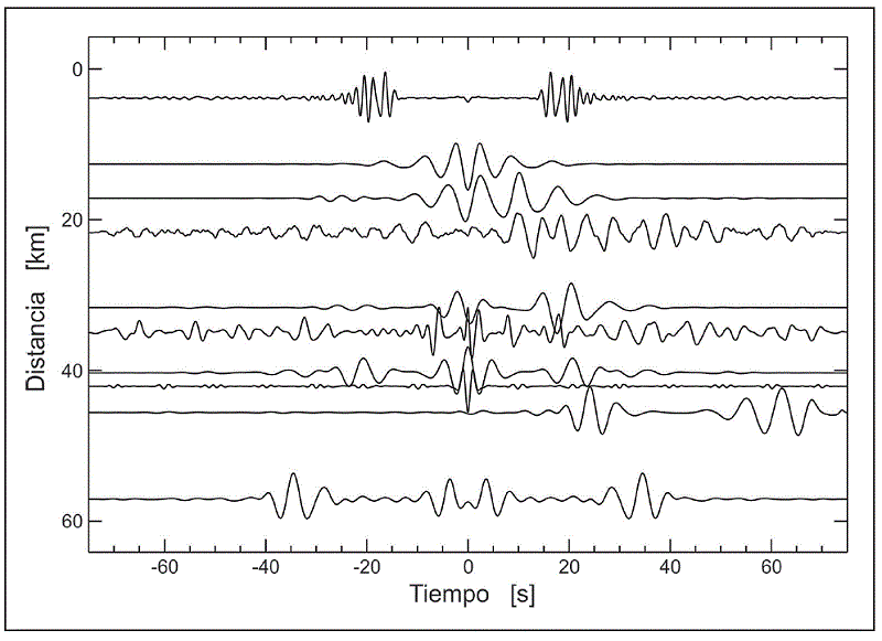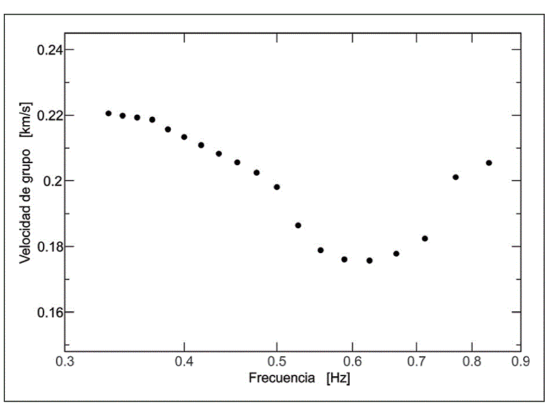 El procesamiento de registros de sismos para estimar velocidades de grupo para cada trayectoria fuente-estación es sencillo. La velocidad de grupo de los trenes de ondas Rayleigh de los componentes verticales se obtiene simplemente al observar el tiempo de llegada de los máximos de la envolvente de la traza filtrada en distintas bandas de frecuencias (técnica de filtrado múltiple, Dziewonski et al., 1969), tal como lo muestran, por ejemplo, Mokhtar et al. (2001) . El caso del ruido sísmico requiere un análisis adicional. El ruido sísmico o vibración ambiental es la vibración permanente de cualquier punto de la superficie terrestre generada por causas naturales (oleaje en las costas, tormentas, sismos lejanos) o artificiales (maquinaria, vehículos, tránsito de personas). La enorme cantidad de fuentes que genera esa vibración y su continua variación tanto en tiempo como en espacio dan por resultado un campo de ondas estacionario e isotrópico que se aproxima a un campo difuso: no hay un modo de propagación dominante y la contribución de cada modo de propagación es independiente del tiempo y de la posición (Hennino et al., 2001). Muchos artículos han mostrado argumentos, pruebas y demostraciones que muestran la estrecha relación entre la correlación cruzada en el dominio del tiempo de un campo difuso y la función de Green del medio entre los dos puntos de observación ( e.g., Weaver y Lobkis 2001; Snieder 2004; Wapenaar 2004; Roux et al. 2005; Sabra et al. 2005a; Weaver y Lobkis, 2005). La función de Green contiene toda la información necesaria para calcular la propagación de todas las ondas posibles entre los dos puntos de observación (Aki y Richards, 1980).