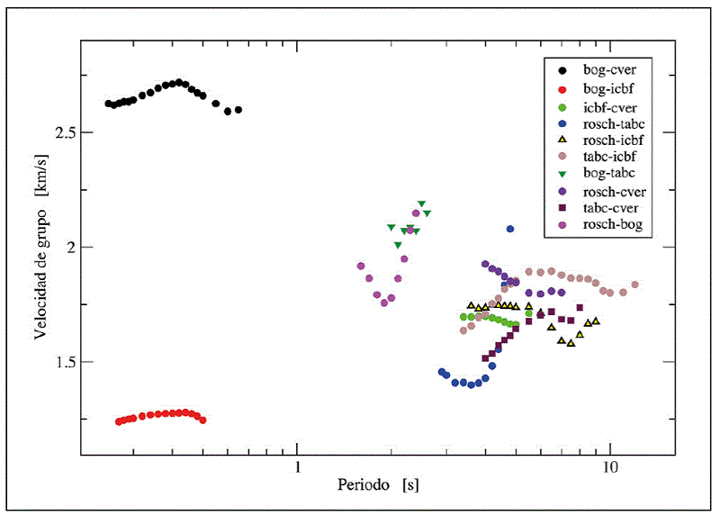 La Figura 8 muestra todas las velocidades de grupo estimadas en este trabajo (con excepción de la curva de dispersión mostrada en la Figura 5). Salvo dos excepciones, los resultados del ruido sísmico registrado en estaciones del SGC proporcionan valores de velocidad de grupo a periodos mayores (frecuencias menores) que los resultados del análisis de sismos. Esto es esperado pues el espectro de Fourier de velocidad de la energía asociada a sismos pequeños como los analizados ocurre a frecuencias relativamente altas. Los sismos proporcionan valores de velocidad de grupo en el rango de frecuencias de 0.3 a 3 s de periodo. En todos los casos, cada trayectoria proporciona valores de velocidad de grupo en un rango pequeño de frecuencias y la variación de velocidad de grupo con la frecuencia es pequeña, con pocas excepciones. La menor velocidad de grupo en la Figura 8 corresponde al ruido sísmico analizado para la pareja BOG-ICBF, pero aun esta estimación indica velocidades de grupo mayores a 1.2 km/s. Dado que las distintas curvas se observan en rangos de periodos pequeños y dado que esos rangos no coinciden para las distintas estimaciones, no es posible calcular una inversión tomográfica a partir de estos resultados.