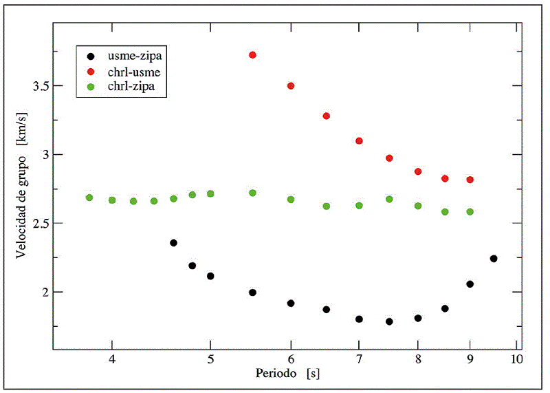 Sólo fue posible calcular correlaciones cruzadas entre tres pares de estaciones de la RSSB. Las curvas de dispersión estimadas se muestran en la Figura 7. El rango de frecuencias es muy similar para los tres casos pero los valores de velocidad de grupo y la forma de las curvas difieren considerablemente. Las velocidades más altas se observan para la pareja CHRL- USME. La forma de esta curva coincide parcialmente con lo esperado para una capa sobre un semi-espacio (Mooney y Bolt, 1966). Sin embargo, la velocidad de ondas de cortante que tendría el estrato sería mayor que la velocidad de grupo observada en el periodo mínimo (3.7 km/s), lo que corresponde forzosamente a un basamento rocoso. La longitud de onda a 9 s de periodo sería mayor a 20 km. Esta pareja probablemente muestrea el basamento rocoso profundo, que puede corresponder a las rocas del Cretácico que predominan a lo largo de esa trayectoria. El resultado para la pareja CHRL -ZIPA presenta una velocidad de grupo casi constante en el rango de periodos de 3.8 a 9 s. La velocidad de ondas Rayleigh corresponde con una velocidad de ondas de cortante de 2.9 km/s. Finalmente, la pareja USME -ZIPA muestra una velocidad de grupo con un mínimo en 7.5 s de periodo. La velocidad de grupo varía entre 1.8 y 2.4 km/s. Un posible estrato correspondiente a esa curva de dispersión tendría un espesor del orden de 8.5 km. La pequeña distancia entre las dos estaciones y el que la mayor parte de la trayectoria atraviese la Sabana de Bogotá sugiere que esta pareja de estaciones permite observar el basamento bajo los sedimentos superficiales de la Sabana.