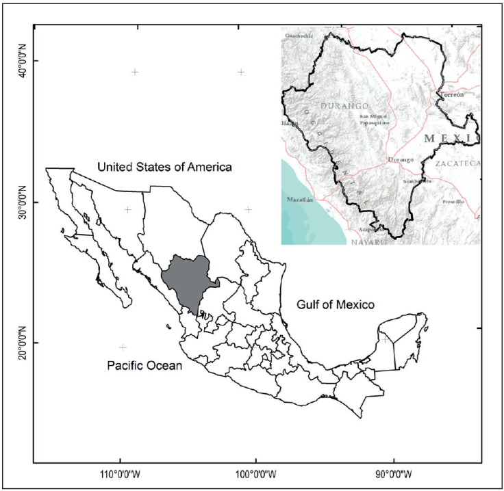 Study Area. Wildfire data was collected for temperate forests of the State of Durango, Mexico. The State is located in the north-central portion of Mexico and has an area of approximately 12.3 M ha (Figure 1). It spans 22º35’ NL and 104º50’ WL; 24º44’ NL and 22º58’ WL; 26º83’ NL and 104º27’ WL, and 23º52’ NL and 107º21’ WL; neighboring the States of Chihuahua and Coahuila to the north and east; Coahuila and Zacatecas to the east, Zacatecas and Nayarit to the south and Sinaloa and Nayarit to the west. Four main physiographic regions characterize the State; a) the Western Plains of the Pacific Ocean, b) the Sierra Madre Occidental Mountain Range, SMW, c) the Central Valleys of Durango and Chihuahua, and d) the Chihuahuan Desert.
