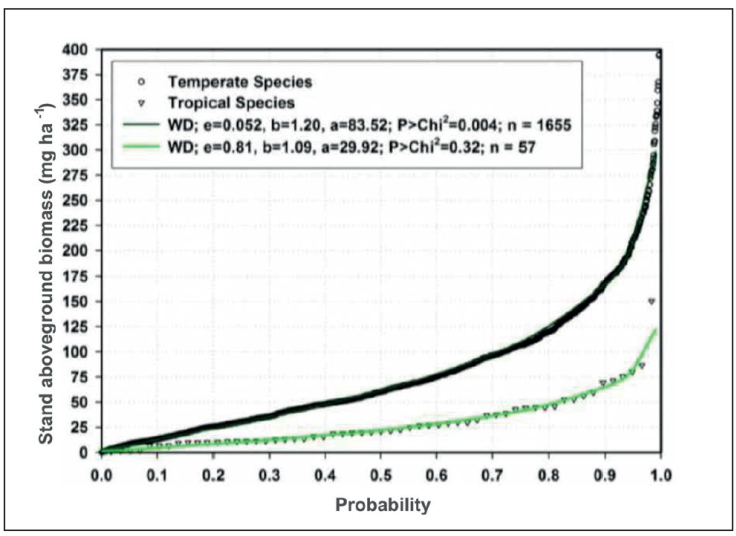 Using the diameter growth Eq. (D = f(T)) described by the sigmoid Chapmna-Richards function for local forests (Corral-Rivas and Návar-Cháidez, 2005); the Den = f(D) by Eq. [6], as well as the AGB =f(D) equation for individual trees reported earlier (Návar, 2009), we derived the cumulative AGB of killed trees by competition that are eventually aggregated to the forest floor as the main necromass input. Figure 7 presents the AGB density of killed trees by competition.
