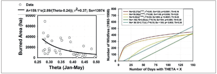 Making several further assumptions, the θ is evaluated with very good preliminary expectations as it correlates well with wildfires (0.34 ≤ r2≤ 0.95); tree growth and productivity (0.40 ≤ r2≤ 0.50); pulses of tree dieback (0.34 ≤ r2≤ 0.50) (Návar, 2015). In fact, the best prediction equations of Tables 2 and 3 include θ as the most significant explanatory variable. However, Návar (2015) has found the predictive power of θ weakens as the wildfire time series data lengthens.