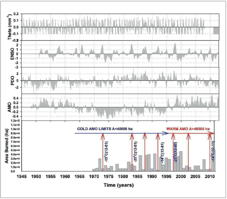 Intense flashy frosts usually make several tree species shed an important part of the foliage in the course of weeks; adding important amounts of biomass composed of fresh foliage and branches to the forest floor (Rocha-Loredo and Ramírez-Marcial, 2009; Návar-Cháidez and Jurado-Ybarra, 2009). Warm easterlies temperatures further desiccate fuel loads; set erratic hot-temperature waves of air masses (promoting hotspots in forests) further weakening live forests and frequently promoting tree die off increasing further on-site fuel loads (Allen et al., 2010; Raffa et al., 2010; Návar, 2015). The dry spell intensifies and magnifies in spatial extent drying further any additional fuel load including live trees, shrubs, forbs and grasses. This scenario has repeated several times in the past and set free the presence of important high-severity wildfires in Northern forests of Mexico. Note that when the AMO is in a cold phase (1970-1995), the burned area by wildfires hardly exceeds; A ≤ 40,000 ha; in contrast to when it is in a warm phase; A>40,000 ha. Same thing happens to the intensity or failure of each or both the ENSO and PDO anomalies that control part of the wildfire variability. This is the partial reason why any of these SST anomalies alone would account for only a small portion of the wildfire variance.