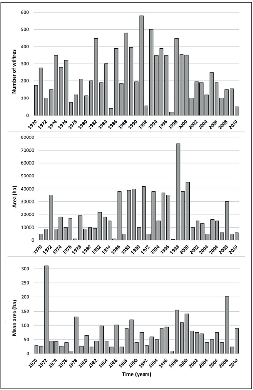 Forest wildfire data. Annual data covering the number of wildfires, the total burned area and a derived variable the mean burned area (e.g., total burned area / number of wildfires) was available for the State of Durango Mexico from 1970 to 2011 (Figure 2).