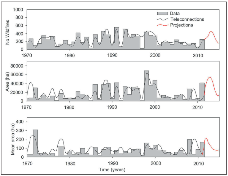 The simulated burned area time series retains the statistics (e.g., for the mean burned area; mean = 20189 ha; standard deviation = 18373 ha; skew coefficient = 1.27) in contrast to the original measured time series (mean = 17753 ha; standard deviation = 15925 ha; skew coefficient = 1.18). The predictive power of these probabilistic models decrease in contrast with the ARIMA models (r2 ≤ 0.45) using a single realization of random numbers. Stronger Monte Carlo simulations may or may not improve the predictive power but they will probably extract better the true probabilities as well as any tendencies if any that would yield most robust likely future scenarios.