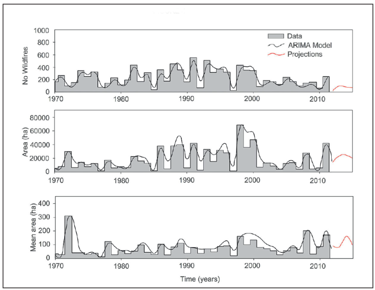 The advantage or disadvantage in rapid changing world climate extreme variability events, when using these stochastic models is that they can predict the future wildfire data with the same statistical properties as the original data set. Other ARIMA models using heterogeneous variance (ARCH and GARCH) had been recently developed that improve the predictability power for the time series with heteroscedasticity properties. However, the wildfire time series for Durango was tested for stationarity and independence and it is not long enough to show the likely heterogeneous variance that must have the high-severity in contrast to the small-severity wildfires and to fit the new ARIMA models. Other composed ARIMA models in conjunction with explanatory variables that may lead to the development of parametric models are under development and they will become better prediction techniques once they are tested and become available in the near future.