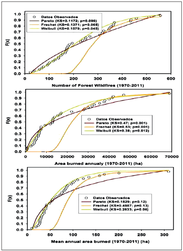 Probabilistic Models. Probability density functions. Probabilistic models project random values of the variable of interest, in this case the wildfire data, by fitting probabilistic density functions, pdf (Haan, 2003). Several pdf models had been fitted to wildfire data amongst which the Frechet, Truncated Pareto, Weibull are the most commonly cited (Alvarado et al., 1998). The selection of the pdf that best fit the random data commonly uses the classic goodness of fit tests the xi2 and the Kolmogorov-Smirnoff tests.