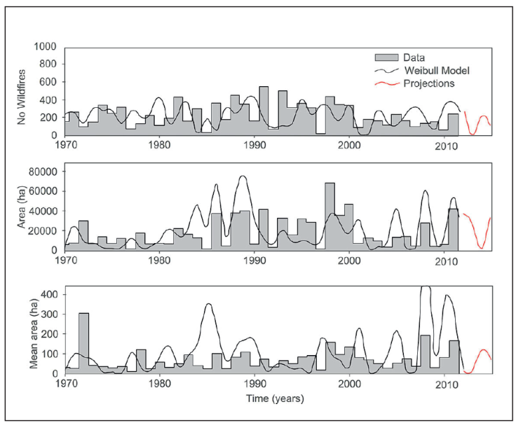 As an example, forest wildfires in number, area and mean area were predicted using stochastic, probabilistic, and physical models as well as a conceptual more comprehensive model was proposed.