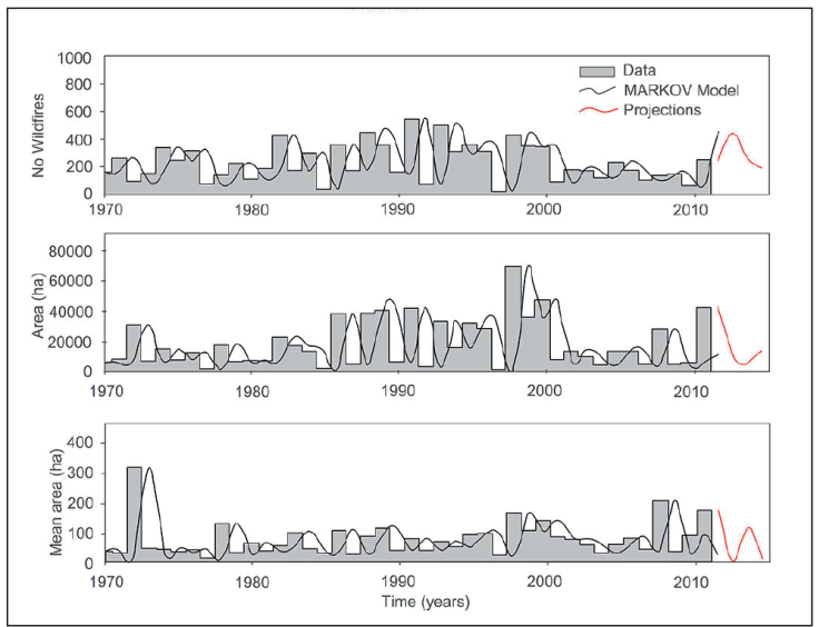Future predictions of the area burned can be conducted using the three states matrix if for one moment it is assumed wildfires are not independent year after year by observing the area burned e.g., in 2012 (51626 ha; State = 3), the probability that A≤ 30000 ha in 2013 is then 99%; the probability that A ≤ 15000 ha in 2013 is then 72%; and the probability that 15000 ≤ A ≤ 30000 ha in 2013 is then 28%. The probability of the occurrence of wildfires with A ≥ 30000 ha in 2014 is 22%.