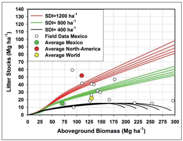 Litter stocks. A physical model that predicts litter stocks and accumulation rates as a function of total aboveground biomass, the rate of losses weighted by site productivity was proposed for northern non-industrial reforested stands of Mexico (Návar, 2019). The physically-based model predicts cumulative litter stocks, LS, in growing forests. The model is parameterized using a mass balance budget approach as described below;