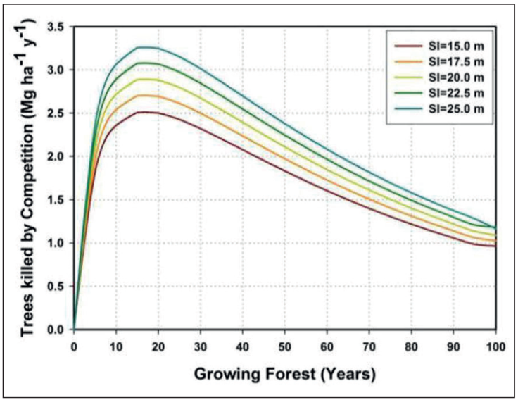 The annual tree mortality rate by intrinsic competition has an average of 2.0 Mg ha-1y-1. As expected it is more acute in the most productive forests. In temperate forests of Durango, Mexico, high-severity wildfires present an average frequency of approximately 30 years (Rodriguez-Trejo and Fule, 2003; Drury and Veblen, 2008) and using this information, under no management practices of on-site killed trees by competition, this forest would accumulate an average of 60 Mg ha-1. However, because necromass has a half life time in the environment of 20 years as it decays over time; the final necromass density would be in the range of 20 to 30 Mg ha-1 during any average time interval between two consecutive high-severity wildfires.
