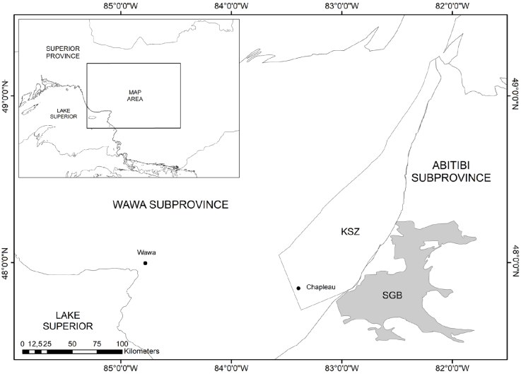 The SGB is connected with the southern Abitibi belt by thin slivers of volcanic-sedimentary rocks associated with the Porcupine-Destor deformation zone (PDDZ) and the Ridout deformation zone (RDZ) in the northern and in the southern margins, respectively, of the Kenogamissi granitoid complex (van Breemen et al., 2006). The Kenogamissi batholith complex and the Ramsey-Algoma granitoid complex mainly comprise felsic to intermediate intrusive rocks.