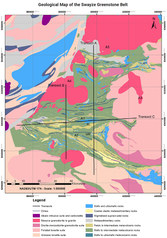 The Swayze greenstone belt (SGB) is located in the western Abitibi subprovince of the Superior Province in Ontario, Canada (Figure 1). It is an Archean-age greenstone belt composed of metavolcanic, metasedimentary and metaplutonic rock types (Heather et al., 1995). The SGB was a focus area of the Metal Earth project of the MERC (Mineral Exploration Research Centre, Laurentian University, Sudbury), which involved crustal-scale geophysical investigations of the Swayze greenstone belt area with reflection seismic, magnetotelluric and gravity surveys. Geological mapping was also done along the geophysical transects, to provide an up-to-date base for the interpretation of the geophysical data (Haugaard et al., 2017).