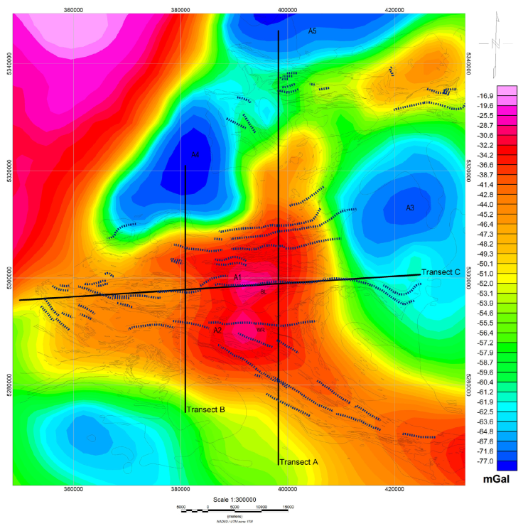 In the area of this study, the values of the Bouguer Anomaly range from -16,9 to -77 mGal (Figure 3). In the area labelled A1 in Figure 3 exists a symmetry with respect to the fold axis of the Brett Lake Syncline (BL). This also occurs in the area A2 with respect to the fold axis of the Woman River Anticline (WR). Despite their symmetry, these areas do not show significant changes in the value of the Bouguer anomaly away from the fold axes. On the other hand, the areas A3 (Kenogamissi granitoid complex), A4 (Biggs Pluton) and A5 (Nat River granitoid complex) are characterized by the lowest values of the anomaly, which indicates that the rocks underlying these areas are less dense than their surroundings. These areas correspond to granitic plutons that are less dense than the volcanic rocks they surround. There are also other small intrusions throughout the SGB but those do not represent significant gravity lows in the values of the Bouguer Anomaly.