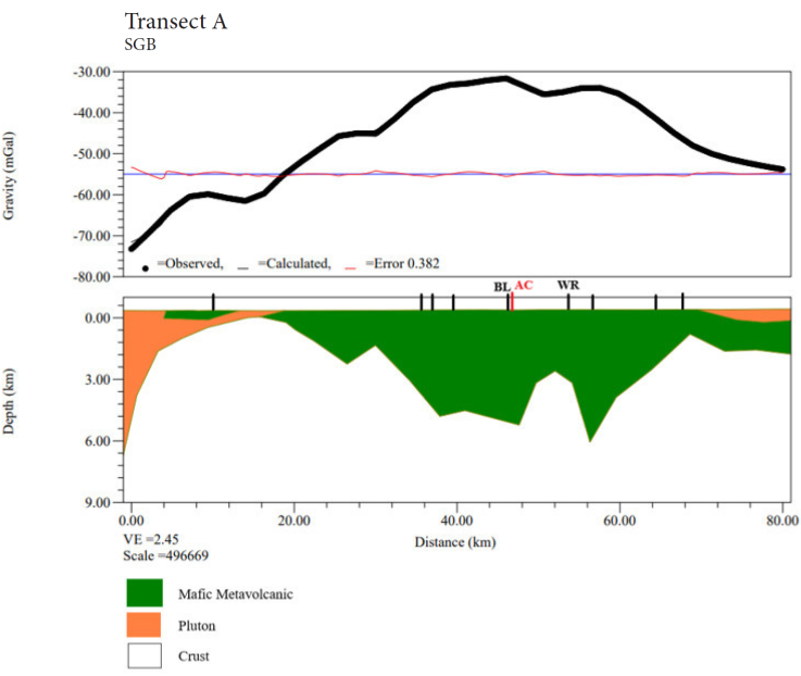 There are two main folds in the SGB: the Brett Lake Syncline and the Woman River Anticline which are labeled in Figure 2 and in Figure 3 with the letters BL and WR, respectively. The SGB is divided in six supracrustal groups from the oldest to the youngest: Chester, Marion, Biscotasing, Trailbreaker, Swayze and Ridout groups (Heather, 2001). For the purpose of gravity modelling in this project, this package of supracrustal groups was considered as a mafic metavolcanic body, given the fact that this rock type is dominant.