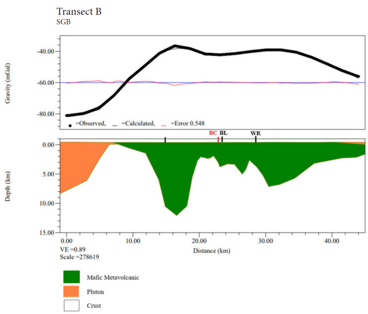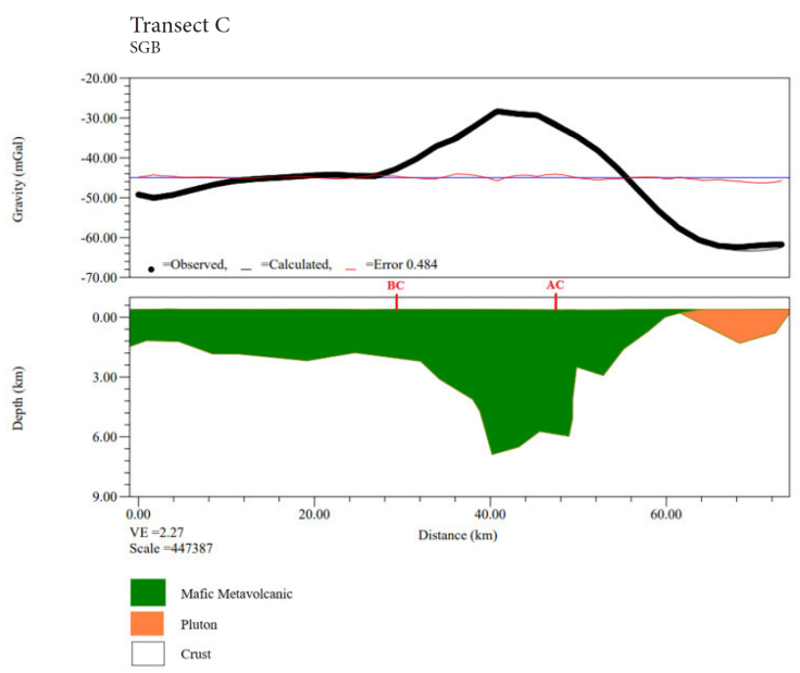 In Figure 4, it is observed that the highest peak of the Bouguer anomaly is located mainly on the axis of the Brett Lake Syncline. The lowest values of the Bouguer anomaly along the profile correspond to the Nat River granitoid complex north of the Swayze greenstone belt. The deepest parts of the model of the greenstone belt occurs where the Brett Lake Syncline and Woman River Anticline are located, between kilometers 45 and 55, in two roots with observed depths of 4 and 5 km, respectively. On the other hand, in the northern part of the profile, outcropping mafic volcanic rocks appear to extend to a depth of less than 1 km.