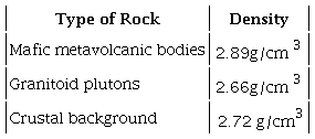 For the three models, the geologic bodies were grouped into two categories with different density values, as well as density contrasts, relative to the upper crustal background: mafic metavolcanic bodies, ρ=2.89g/cm3 and a density contrast of +0.17g/cm3 relative to the crustal background; granitoid plutons, with ρ=2.88 g/cm3 and a density contrast of -0.06g/ cm3 relative to the crustal background. The density values used in the forward models are also summarized in Table 1.