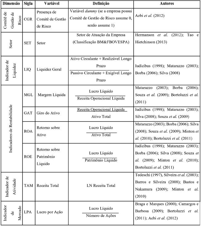 Assim, vislumbra-se uma lacuna de pesquisa em determinar se a gestão de risco apresenta efeitos sobre o desempenho econômico das empresas. E ampliam-se estudos como os de Oliveira (2004), Trapp e Corrar (2005), Godoy et al. (2011), Napolitano e Rabechini Junior (2012) que objetivaram descrever as práticas utilizadas, a fim de gerir os riscos, orientadas por instrução normativa, avaliaram riscos operacionais por meio de métodos e estudaram a forma da gestão de risco poder influenciar o desempenho das suas atividades. Tais estudos centraram-se em descrever as práticas de risco operacional em organizações, sem relacioná-las com o desempenho econômico. Deste modo, com este artigo, trazem-se evidências empíricas adicionais sobre o tema investigado.