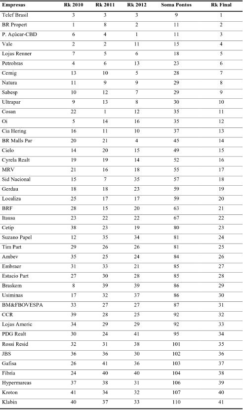 Destaca-se ainda, que a empresa Telef Brasil, nos três anos analisados, manteve-se na 3.ª posição, demonstrando constância no desempenho econômico, comparativamente as demais empresas analisadas. Já a empresa BR Propert no ano de 2010 liderou o ranking, mas em 2011 caiu sete posições e no ano de 2012 retornou a ocupar uma das primeiras colocações. No que tange a empresa P. Açúcar - CBD ocorreu o contrário da empresa BR Propert, visto que no ano de 2010 constava na 6.ª posição, em 2011 na 4.ª e em 2012 passou a liderar o ranking, o que evidencia que, durante o período analisado, melhorou o seu desempenho econômico.