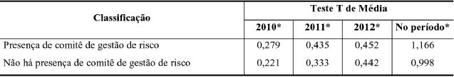 As empresas que tinham comitê de gestão de risco em sua estrutura de governança corporativa apresentaram as seguintes médias: 0,297 no ano de 2010; 0,435 no ano de 2011; e 0,452 no ano de 2012. No período acumulado, obtiveram média de 1,166. Em relação às empresas que não apresentaram comitê de gestão de risco, as médias foram as seguintes: 0,221 em 2010; 0,333 em 2011; e 0,442 em 2012. No acumulado do período, a média foi de 0,998.