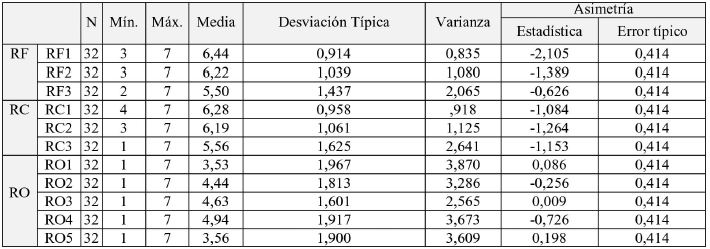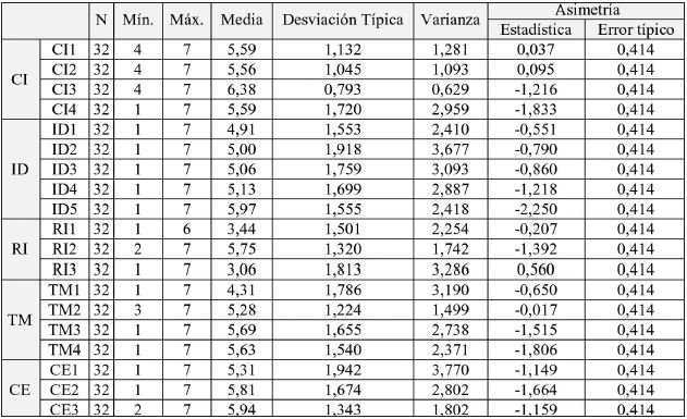 La estadística descriptiva del perfil del emprendedor (ver Tabla 1) muestra que los 32 son válidos en todos los ítems. Las medias de los valores en las escalas muestran que los directivos están entre concuerdo parcialmente (5) hasta concuerdo (6), siendo RI1 y RI3 los únicos ítems con concordancia parcial (3).