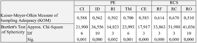 En el análisis factorial, comprobando todos los ítems que en conjunto deberán explicar el perfil del emprendedor se muestra cómo todos son reproducidos con más de un 75%. En los ítems ID y RI donde KMO es igual a 0,562 e 0,502, respectivamente, los valores se encuentran en el límite recomendable, lo que puede ser interpretado de tal manera que los resultados podrían no ser muy satisfactorios (ver Tabla 3). Sin embargo, todos los valores de la esfericidad de Bartlett tienen una Sig. menor que 0,05, tres de ellas con valor cero, lo que indica relaciones significativas entre las variables y por tanto la aplicabilidad del análisis factorial.