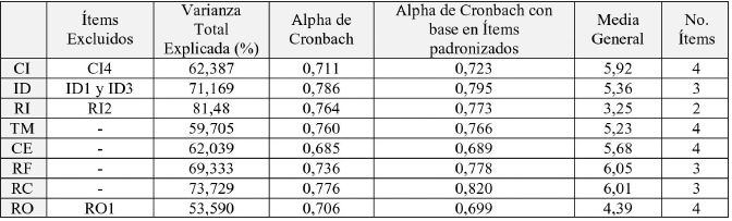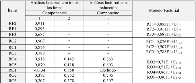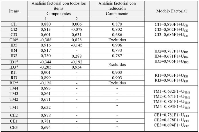 La variable RI a pesar de que en el primer análisis se obtiene un único factor, éste explica el 54,53% de la varianza total. Sin embargo, el ítem RI2 es excluido en el análisis debido a que su carga factorial no es representativa. En correspondencia, las variables TM y CE, se representan en factores únicos, cumpliendo la característica de explicar estos componentes.