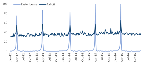 Currently, the rabbit’s role in Australian culture is most notorious during Easter, a major national holiday, when it gets a center stage role as the “Easter bunny” responsible for distributing Easter chocolates. This tendency can be seen when looking at weekly trends in internet searches in Australia (see Figure 1), with searches for “Easter bunny” being highly seasonal as expected, but peaking at the same time as searches for “Rabbit”.