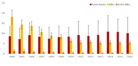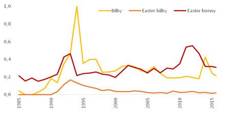 Along the way, much has been written about the potential success or failure of the Easter Bilby as a marketing strategy to support conservation of Australian native species, and its potential to replace the Easter bunny in the long term (Faithfull, 2000; Smith, 2006; Garnett and Kessing, 2001). Yet, these discussions have at best been based on anecdotal data. To gain a more systematic insight into this issue, I aimed to measure over time how the value of the Easter Bilby has changed, in particular compared to its rival, the Easter bunny.