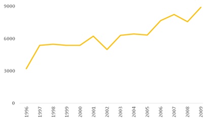 While the results suggest the customer-based brand equity of the Easter Bilby is declining, it is also important to look at how the brand is performing in term of financial brand equity (Lassar et al., 1995). I did this by looking at how royalties for the Easter Bilby trademark have varied from 1996 to 2009, the dataset available (see Figure 5).