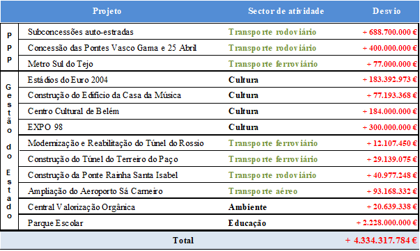 A construção da Ponte Rainha Santa Isabel em Coimbra, a construção do Edifício Casa da Música no Porto, a construção dos Estádios do Euro 2004, a construção do Centro Cultural de Belém (CCB) em Lisboa e o Metro Ligeiro da Margem Sul do Tejo, são alguns exemplos destes desvios.