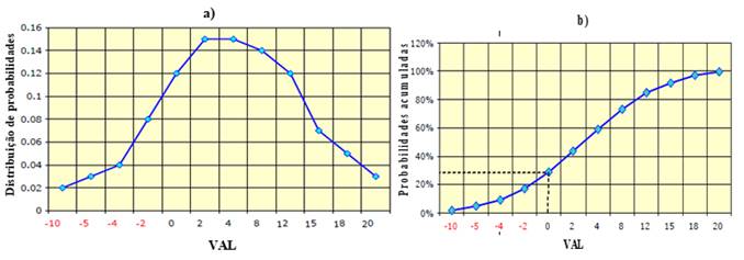 A forma mais útil de apresentar o resultado do VAL ou da TIR é expressá-lo em termos de distribuição de probabilidade ou de probabilidade acumulada, no intervalo de valores resultante da simulação. A Figura 2 fornece um exemplo gráfico da distribuição de probabilidades para o VAL.