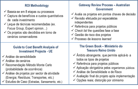 Seguidamente são apresentados os principais modelos de boas práticas internacionais, utilizados na análise (ex ante) e na avaliação a posteriori (ex post) de projetos de investimento concretamente: o Gateway Review Process (GRP, 2009), inspirado no GRP do Reino Unido, adotado pelo Ministério do Tesouro e das Finanças da Austrália, o Guide to Cost Benefit Analysis of Investment Projetcts (GCBAIP, 2008), editado pela Comissão Europeia, o The Green Book (GB, 2003) - Appraisal and Evaluation in Central Government, editado pelo Ministério das Finanças do Reino Unido (departamento do governo britânico designado por Her Majesty's Treasury, ou simplesmente por Treasury ou Exchequer) e o ROI Institute Methodology do ROI Institute Inc. (ROII, 2007), uma metodologia de natureza norte-americana, que sustentam o desenvolvimento da presente investigação.