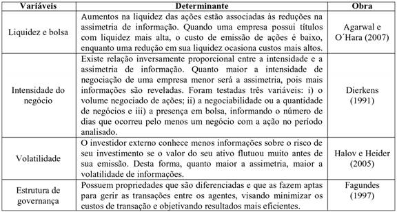 A volatilidade, como medida de assimetria informacional, foi utilizada por Halov e Heider (2005). Os autores argumentaram que, quando as ações flutuam muito antes de sua emissão, podem apresentar custo de seleção adversa da dívida bem maior que as empresas que tiveram ativos estáveis, fazendo com que o investidor externo saiba menos sobre o risco do investimento que irá fazer se a ação que irá adquirir flutuar muito antes de sua emissão.