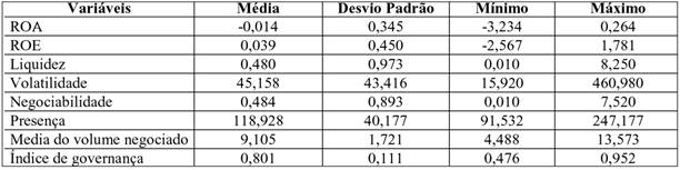 Dada à necessidade de corrigir dados com valores atípicos, foi utilizada a transformação logarítmica (Ln) para a variável média do volume e, desta forma, foram reduzidas algumas assimetrias. Depois foram definidas as variáveis do desempenho econômico, ROE e ROA, e as variáveis proxies que representam a assimetria de informação.