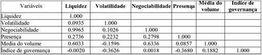 A variável negociabilidade apresentou correlação forte com a variável liquidez. Para confirmar a exclusão de uma dessas variáveis, detectando multicolinearidade, foi utilizada a medida de tolerância (1/VIF), definida como 1-R2. Quando seus valores apresentam-se próximos de 0, indicam que a variável analisada pode ser prevista com alta precisão pelas outras variáveis. O inverso dessa tolerância é representado pelo variance inflation fator (VIF) (). Este se tiver valores altos apresenta indicativos de multicolinearidade.