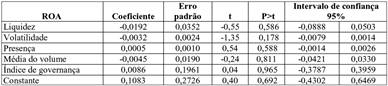 A verificação da autocorrelação também é um importante pressuposto para verificar se os resíduos não estão correlacionados; caso isso se confirme, os parâmetros podem não ter sua eficiência garantida dado o viés nos erros padrões (Drukker, 2003), por mais que sejam corrigidos pelos efeitos da heterocedasticidade. Para a correção simultânea da heterocedasticidade e da autocorrelação foi utilizada a correção de Newey-West (Newey e West, 1987), que se revelou robusta na existência de ambas. E, na sequência, prosseguiu-se com a estimação do modelo de regressão. O primeiro modelo de regressão foi com a utilização da variável dependente ROA.