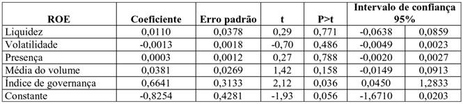 Outra análise foi realizada, mas desta vez, com a variável dependente ROE, considerando a exclusão da variável negociabilidade. Também foi estimado o teste de Breusch-Pagan, verificando que o modelo apresenta heterocedasticidade, e foi utilizado o método de estimação robusto para correção da heterocedasticidade e autocorrelação. A Tabela 4 apresenta esta regressão.