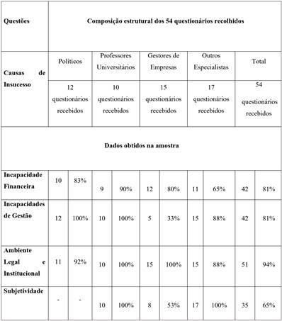 A partir da análise empírica a esta matéria, e tendo em conta a análise quantitativa que derivou dos primeiros 54 questionários analisados, de forma a aferir um conjunto de sugestões que possam ser equacionadas em futuros processos de privatização, constataram-se as seguintes cinco razões que estiveram na base do insucesso dos processos de privatização no período referido: a incapacidade financeira; incapacidades de gestão; o ambiente legal e institucional; a subjetividade do processo; e a falta de formação especializada (ver Tabelas 1 e 2, pp. 51-52).