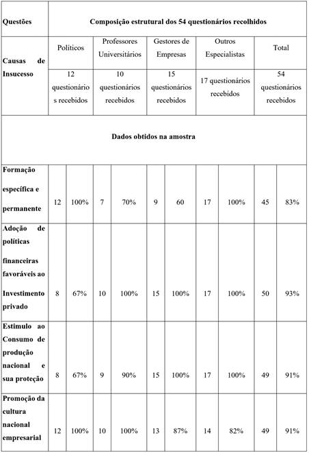Neste âmbito de análise, a leitura dos dados dos questionários demonstram, de forma consensual, que o sucesso dos processos de privatização depende de quatro aspetos: formação específica e permanente dos gestores e restantes colaboradores que gerem os seus desígnios; adoção de políticas financeiras que favoreçam os investimentos privados; desenvolvimento e promoção de incentivos ao consumo da produção nacional como condição de sustentabilidade das empresas privatizadas; e promoção de uma cultura empresarial consistente que constitua uma verdadeira alavanca de crescimento e desenvolvimento nacional (ver Tabela 2).