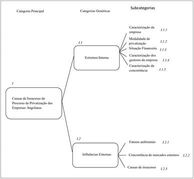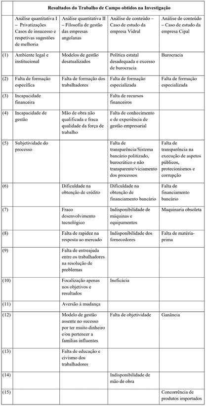 Em detalhe, na análise de conteúdo realizada às empresas Vidrul e Cipal foram identificadas como principais causas de insucesso dos processos de privatização em Angola: (1) falta de transparência, (2) excesso de burocracia, (3) ineficácia, (4) falta de objetividade, (5) viciamento do processo, (6) falta de conhecimento e de experiência de gestão empresarial dos seus gestores, (7) falta de recursos financeiros, (8) política financeira estatal inadequada, (9) sistema bancário excessivamente politizado, burocratizado e não transparente, (10) indisponibilidade de mão de obra qualificada, (11) escassez de fornecedores, (12) falta de máquinas e equipamentos, (13) dificuldade na obtenção de financiamento bancário, (14) instabilidade política, e (15) falta de formação e de (16) educação e civismo dos trabalhadores.