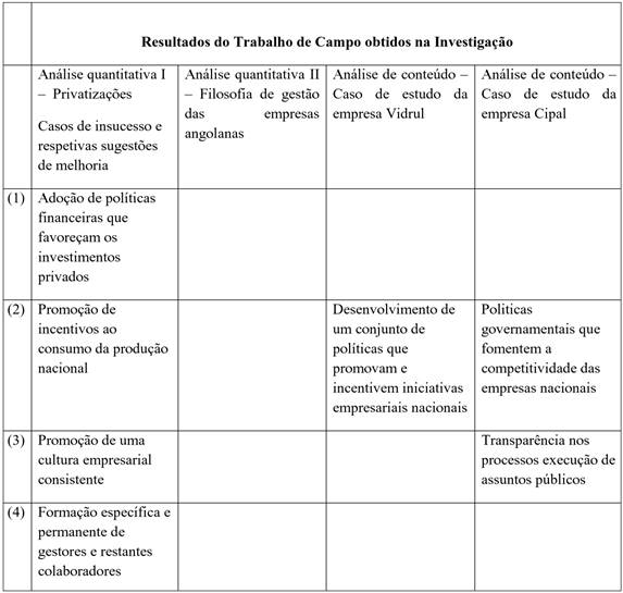 Em suma, a leitura dos dados dos questionários e das entrevistas demonstram de forma consensual, que o sucesso dos processos de privatização depende: (1) da fomentação uma cultura consciencializada para a mudança, a partir de políticas que privilegiem o envolvimento dos trabalhadores; (2) de uma comunicação descentralizada que realce o espírito de pertença a um grupo; (3) da comunicação a todos relativamente aos objetivos organizacionais; (4) da possibilidade dos trabalhadores se pronunciarem sobre assuntos relacionados com o seu trabalho; (5) do encorajamento dos trabalhadores para desenvolverem as suas capacidades; (6) da aposta em efeitos motivacionais que preparem os trabalhadores para a realização de esforços suplementares; (7) da ênfase nos estudos de mercado; (8) do tratamento equitativo e de qualidade a todos os clientes; (9) da preocupação no campo social por parte das empresas relativamente ao futuro dos trabalhadores; (10) do mérito e competência como fatores de identificação de respeito; (11) da ligação do empreendedorismo a sucesso sendo algo que deve estar na génese de toda a estrutura da sociedade; (12) da facilidade de aceder mais facilmente ao crédito; (13) da contratação de mão de obra qualificada; (14) da contratação de técnicos de gestão com grande conhecimento e competências apropria- das para o desempenho das suas funções; (15) da construção de uma dinâmica empresarial assente numa relação custo-preço estável; e (15) do desenvolvimento tecnológico de todo o tecido empresarial angolano (ver Tabelas 3 e 4).