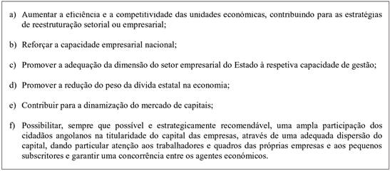 Estas medidas visavam uma intervenção estatal orientada para ações concretas que permitissem uma melhoria significativa da atividade económica, por forma a que a orientação da vida económica e social do país fosse realizada por entidades competentes que promovessem uma maior eficiência no setor empresarial e económico. O que abrangia, por um lado, empresas estatais que não se revestiam de interesse estratégico no quadro de desenvolvimento do setor empresarial do Estado e que fossem dotadas de tecnologias simples ou artesanais, podendo deste modo vir a ser geridas com maior eficácia fora do setor estatal, e, por outro, empresas em que não existisse qualquer interesse em serem integradas noutras entidades ou empresas estatais.