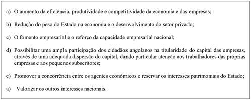 Alguns estudos sobre as indústrias portuguesas, chinesas, brasileiras, e até mesmo coreanas e indianas (Evans, 1997), têm demonstrado o papel do Estado no contexto das privatizações, inclusive podendo ser verificado que este pode mudar ao longo dos tempos. Mas é importante focar o estudo um pouco mais a jusante, nomeadamente refletindo sobre: quais os beneficiários das estratégias de privatização, neste caso no contexto angolano; que tipo de estratégias são utilizadas; que tipo de financiamento é obtido; quais os objetivos concretos da privatização; qual o nível de participação e envolvimento dos trabalhadores; qual o modelo de relação laboral utilizado; que tipo de planos de ação estão envolvidos; qual a qualidade dos produtos e infraestrutura que os sustentam; que tipo de relacionamentos são obtidos com os clientes; quais as bases internacionais para a sua sustentação; qual o nível de conhecimento de mercado que lhe está subjacente; e quais as bases estratégicas em termos de direitos, obrigações, poder, responsabilidades, emprego, influências, igualdade de tratamento, iniciativa, dimensão, força de trabalho, burocracia, empreendedorismo e satisfação.