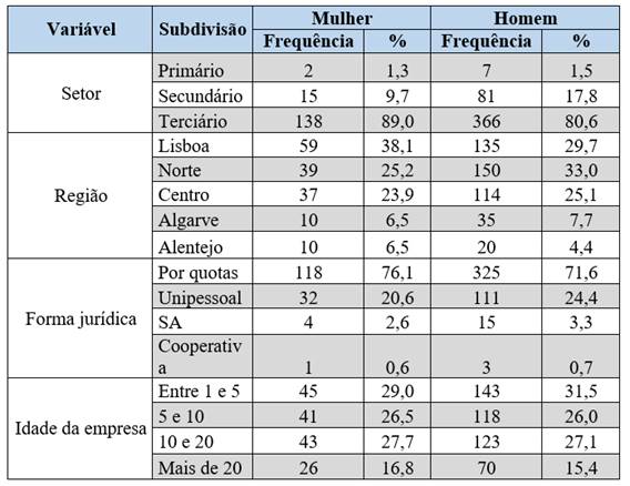Considerando a variável género, apresenta-se no Quadro 1 valores descritivos agrupados por setor, região, forma jurídica e idade da empresa. No Quadro 2, os dados estão agrupados por características do gestor (idade, habilitações, área de formação e anos de experiência).