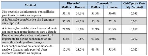 A não necessidade da IC para tomar decisões é apontada por 50,6% dos homens (versus 31,3% para as mulheres). A razão da não utilização por falta da entrega atempada da IC é apontada por 53,1% das mulheres (versus 27,1% nos homens). É evidente o resultado do forte impacto da carga tributária na consciência dos gestores. Nesse aspeto, esse efeito é menos valorizado pelas mulheres (71,9%, versus 83,5%) visto que discordam mais sobre se a IC é essencialmente um meio para apurar impostos. As mulheres reconhecem, mais que os homens (93,8% versus 80%), que para compreender a IC é importante ter conhecimentos em contabilidade de gestão e finanças, observando-se que em 94% das mulheres que concordam com essa afirmação 62,5% concordam totalmente. Dos 80% dos homens que concordam apenas 28% são totalmente concordantes. No mesmo sentido, segue a opinião de que com conhecimentos nestas áreas seria possível obter melhores resultados, verificando-se que estão de acordo com esta ideia 69% das mulheres face a 55% dos homens.