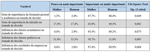 Numa perspetiva associada aos indivíduos, observa-se que é considerado importante o grau de formação do gestor na tomada de decisão, dando a mulher (87,7%) ligeiramente mais importância a esta qualidade do que os homens (80,4%). Quanto à intuição como fator decisivo na tomada de decisão, os resultados são bastante semelhantes, sendo que o homem atribui mais importância a essa característica no momento de decidir. Evidencia-se a influência dos fatores políticos e económicos na tomada de decisão, sem grandes divergências entre géneros. Constata-se a preponderância significativa das mulheres (97,4% versus 89,9%) na opinião de que os resultados da empresa exercem influência na tomada de decisão.